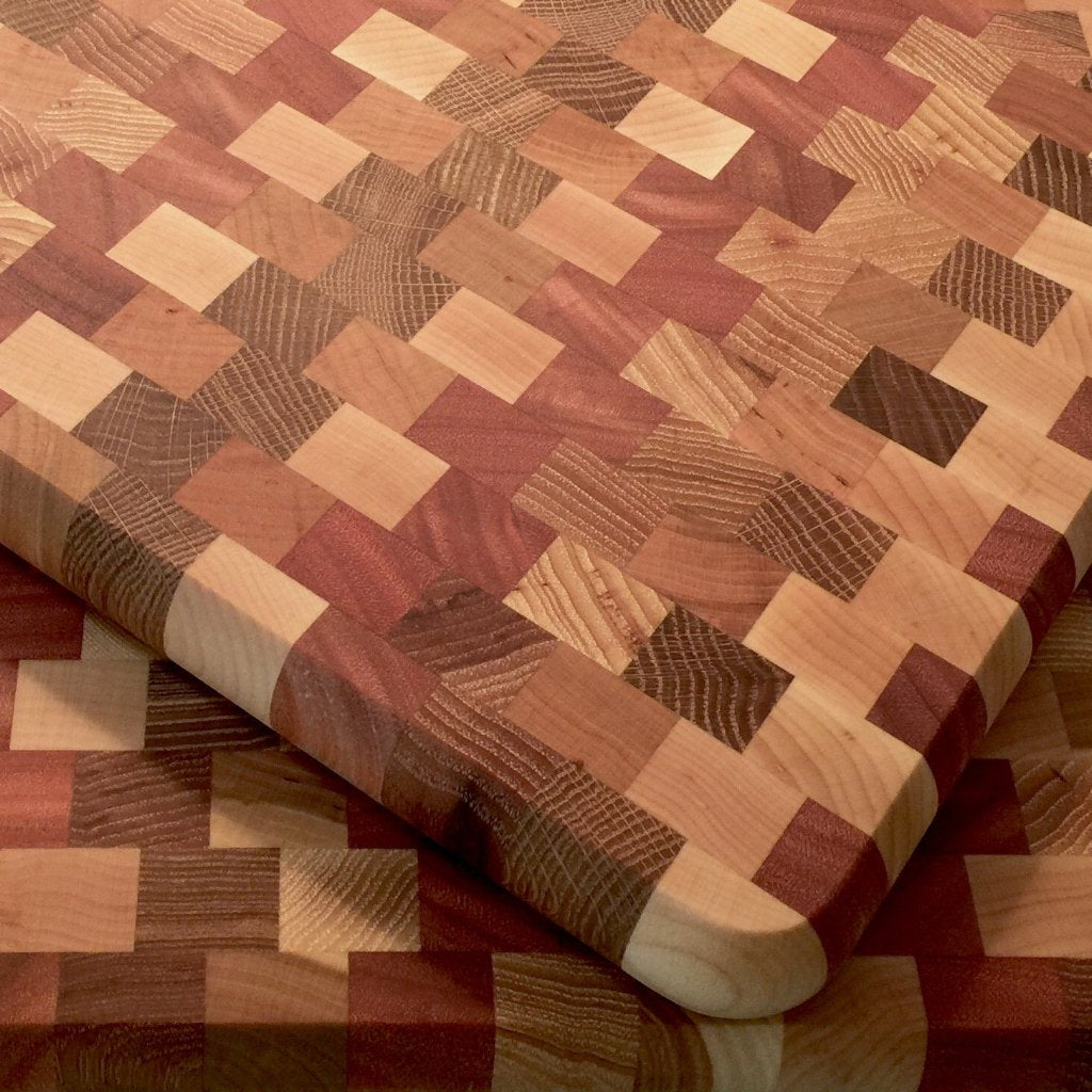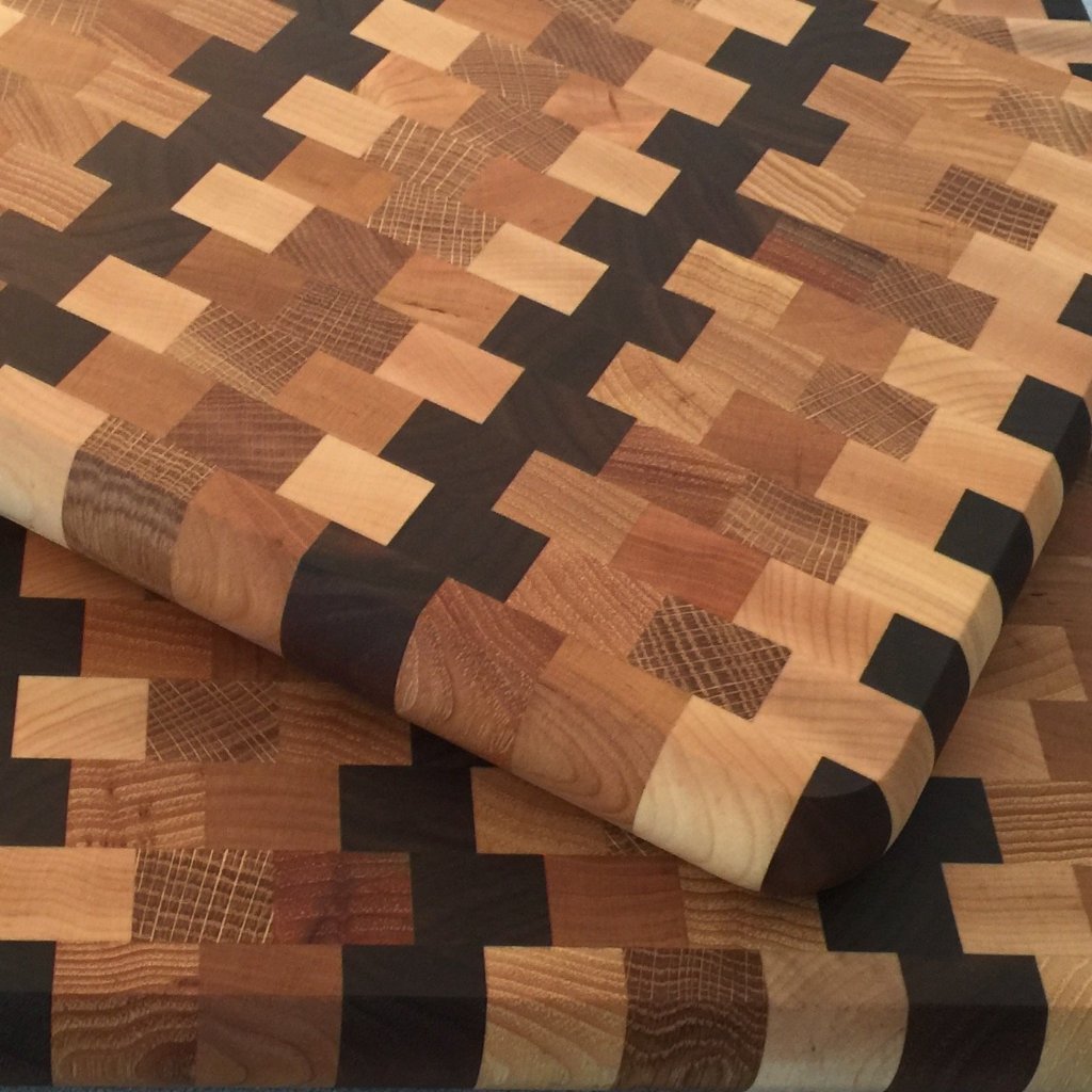 End-grain hardwood cutting boards, handmade with food safe materials. Hand wash only.